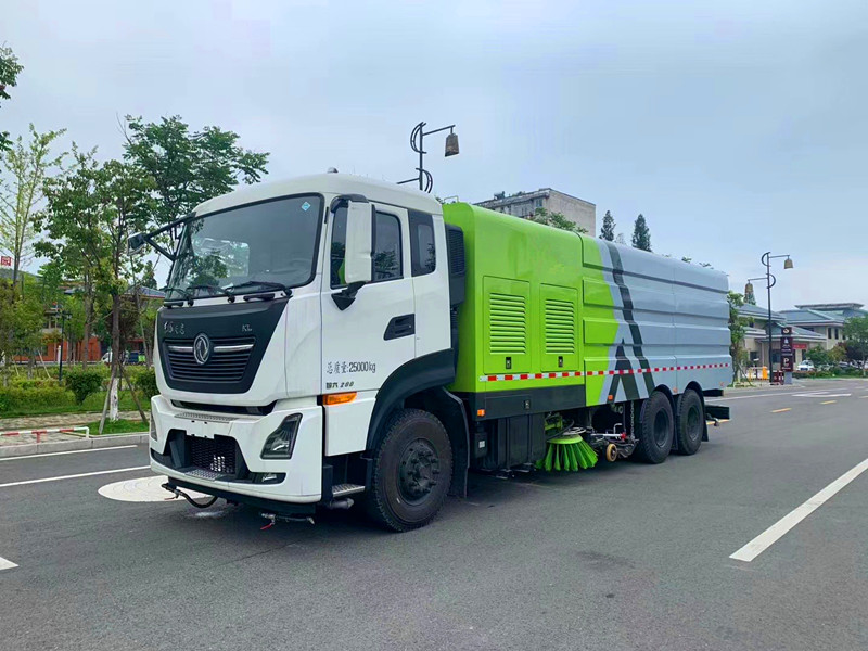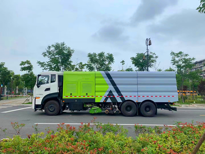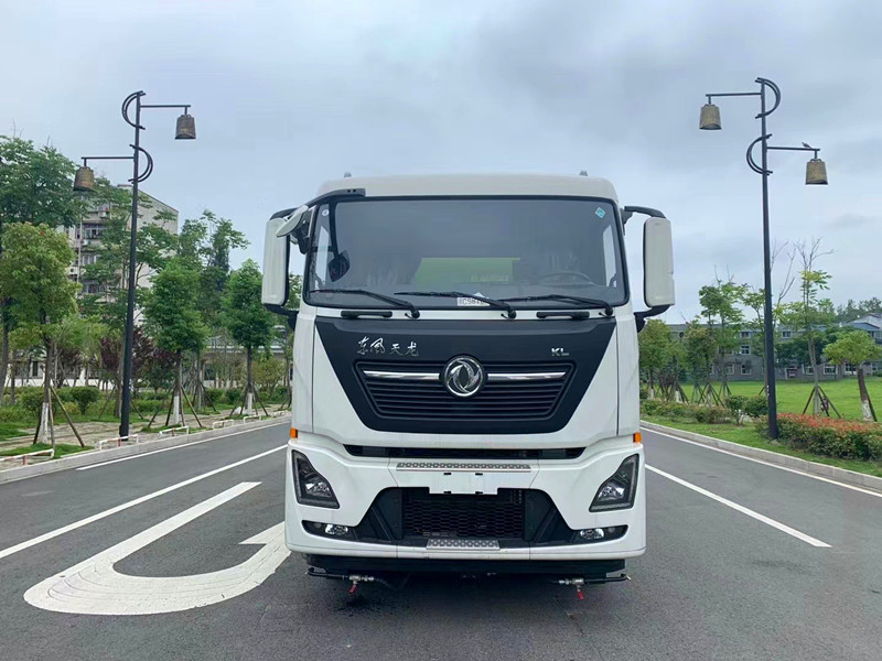 22立方天龍洗掃車采用東風天龍DFH1250D4型國六二類汽車底盤改裝,加裝副發動機、風機、高壓水泵、清水箱、垃圾箱、左右立掃、帶噴水桿的寬吸嘴、低壓沖洗系統、掃盤降塵系統、液壓系統、專用裝置電控系統和副車架等改裝而成。副發動機驅動風機和高壓水泵,副發動機采用東風康明期6缸柴油發動機。風機用8.0高壓離心風機,效率高、風量大,**風量達23500m3/h。高壓水泵采用同際知名GTM-GF36型柱塞柱,流量合適,壓力高,允許**壓力達10MPa,清水箱充分利用了車載空間,容積大,容積達12m3。垃圾箱采用單層不銹鋼結構,傾翻卸料,帶高壓位自潔裝置。自潔裝置可在垃圾箱卸料時幫助卸料,清洗垃圾箱內部。左右立掃為單掃盤,減少了掃刷數量和掃刷消耗量,能降低使用成本。左右立掃分開**,可實現左掃、右掃和全掃等不同作業模式。寬吸嘴的吸口寬度達到2418mm,確保作業總寬度大于3.5mm。4個高度可調的吸嘴輪,能方面調整和保證吸嘴與路面間的合理間隙。吸嘴內高有噴水桿,盡可能多地將高壓洗滌噴嘴布置在吸嘴內部,不但清洗效果好,還能**限度減少高壓水氣流沖起污物產生的二次污染。左右噴水桿安裝在吸嘴上,隨吸嘴升降,結構簡單緊湊,保證噴水桿的離地高度固定不變,達到**清洗效果。開式液壓系統驅動左右立掃升降、左右掃肋旋轉、吸嘴升降、垃圾箱后門開閉、垃圾箱傾翻復位等機械動作。底盤變速箱側取力器驅動低壓水泵,實現灑水車的低壓沖洗功能。一鍵式作業起動和停機操作。