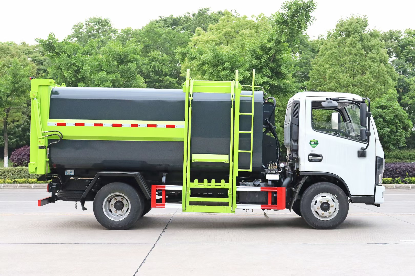 垃圾箱體:箱體采用邊3底4優(yōu)質碳鋼制作,內外防腐防銹,密封性好,運載量大,安全節(jié)能環(huán)保,帶液壓開啟后門。