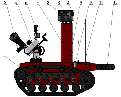 1.照明燈 2. 紅外攝像頭 3.避障傳感器 4.升降桿注油口 5. 80水炮